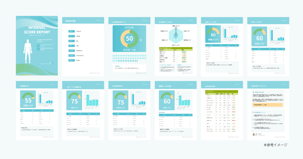 これらを総合的に解析し、**「体内年齢」「炎症スコア」「代謝スコア」**など、健康状態をわかりやすくスコア化します。